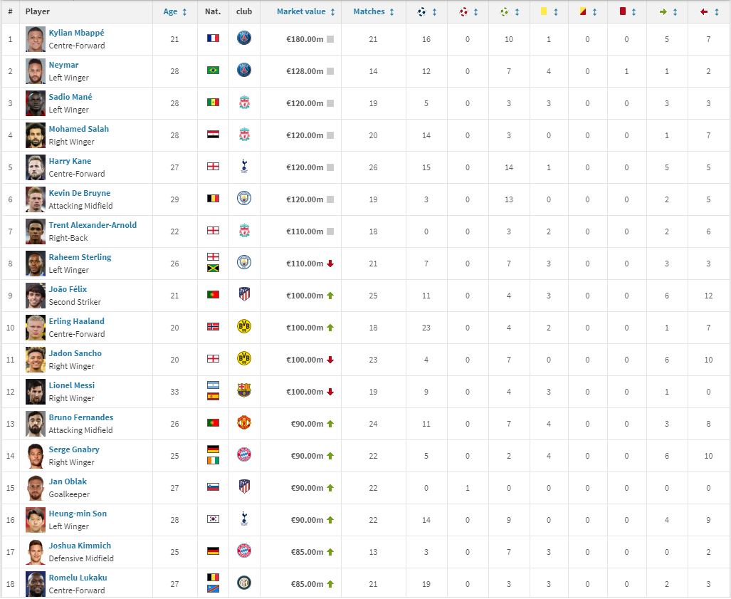 이적 전문 사이트 ‘트랜스퍼마크트’가 밝힌 2020년 12월 기준 축구 선수들의 몸값 순위