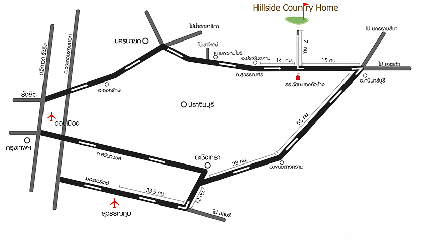 돈무앙 공항을 지나 1번 고속도로를 타고 진행하다 나컨나욕쪽 AH1 도로로 접어든다. 이 도로에서 위한뎅, 나컨나욕을 지나 계속 진행하다 보면 프라찐부리와 갈라지는 도로가 나타나는데 Nonsi(또는 Nonsee)쪽으로 계속 진행하다 보면 골프장 입구가 나타난다.