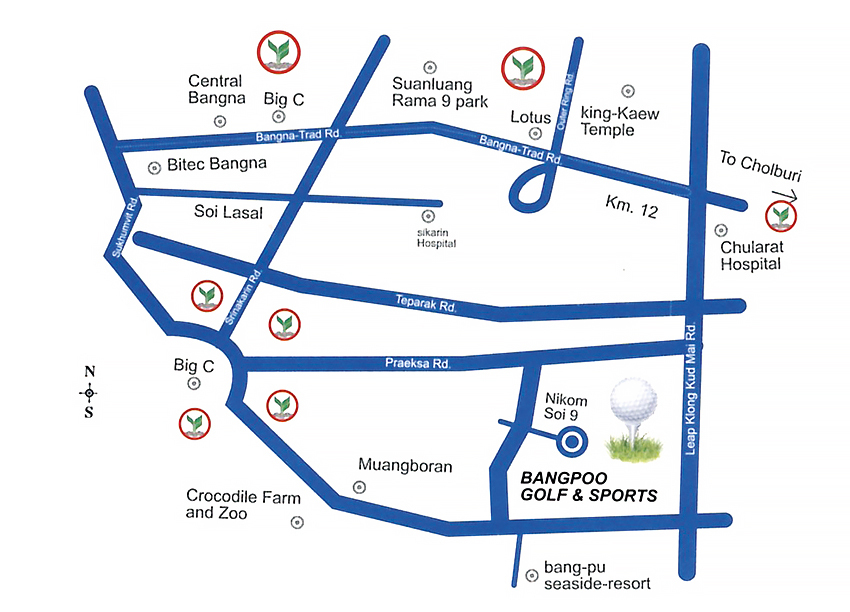 방나-뜨랏 고속도로(루트34)에서 타페락(루트3344)쪽으로 우회전한 후 계속 진행하다 보면 약 10km 전방에 사거리가 나온다. 사거리에서 좌회전 후 Bangpoo Industrial Estate 간판을 따라가다 약 7km 지점에서 우회전하면 쏘이 9가 나오고 동시에 골프장 입구가 나타난다.