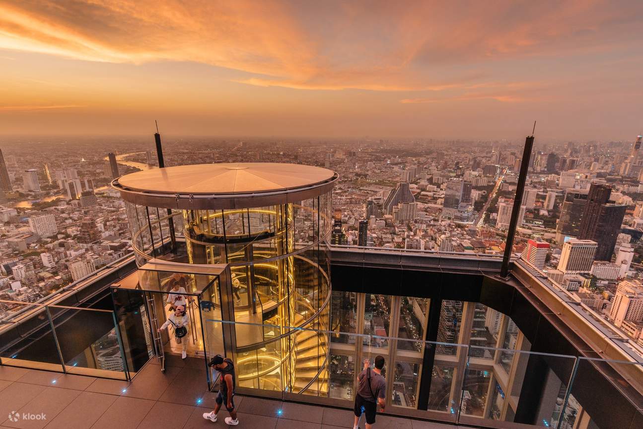 마하나콘 타워(King Power Mahanakhon) – 해가 저물 무렵 방콕 최고층 빌딩인 마하나콘 타워로 향합니다. 아이콘시암에서 다시 셔틀보트를 타고 사판탁신 역으로 돌아간 뒤, BTS로 총논시(Chong Nonsi) 역에 내리면 마하나콘 타워와 연결됩니다. 78층짜리 이 빌딩 꼭대기에는 스카이워크 전망대가 있어 방콕 도심 360도 전망을 즐길 수 있습니다. 특히 일몰~야경 시간대에 올라가면 환상적인 도시 불빛을 감상할 수 있습니다. 전망대는 10:00~19:00 (입장마감 18:30) 운영되며, 티켓은 온라인 사전 구매 시 성인 약 1,000~1,050바트 정도입니다. 건물 내 고속 엘리베이터를 타고 올라가 투명 유리 바닥 위를 걸어보는 짜릿한 경험도 해보세요. 전망대 층에는 **루프탑 바(Sky Beach)**도 있어 방콕의 밤경치를 보며 음료를 즐길 수 있습니다. 단, 늦은 밤에는 운영하지 않으니 저녁 일찍 방문하는 것이 좋습니다. 일정을 마친 후 숙소로 돌아와 휴식을 취합니다. (사진: 마하나콘 타워 옥상 유리바닥 위에 선 여행자의 모습)