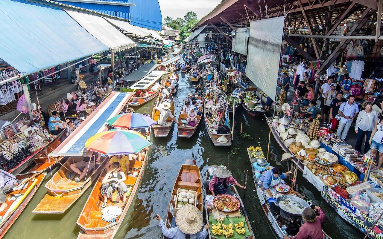담넌 사두억 수상시장 – 셋째 날은 방콕 교외로 나가 현지의 색다른 시장 문화를 체험합니다. 이른 아침 호텔을 출발하여 담넌 사두억 수상시장으로 향합니다. 방콕 시내에서 남서쪽으로 약 100km 떨어져 있어 차량으로 1시간 반~2시간 정도 소요되는 거리입니다. 대부분 이른 아침에 전세 차량을 이용하거나 일일 투어 상품을 예약해 방문하며, 직접 대중교통으로 갈 경우 남부 버스 터미널에서 미니버스를 탈 수도 있습니다. 수상시장은 매일 07:00~11:00 정도에 가장 활발하게 열리며, 오전 9시 이전에 도착해야 한적한 분위기에서 구경할 수 있습니다. 운하 위에 떠있는 보트 상인들이 열대과일, 코코넛 아이스크림, 현지 음식 등을 팔며, 원한다면 소형 보트를 타고 시장 운하를 직접 돌아볼 수도 있습니다(보트 투어 약 150~200바트, 현장 흥정). 현지인들의 살아있는 장터 풍경과 이국적인 사진 촬영 기회가 가득한 담넌 사두억에서 약 1-2시간 정도 보내고 간식거리를 즐겨보세요. (유튜브 브이로그: “담넌 사두억 수상시장 투어” 검색하여 현장 영상을 참고해보세요.)