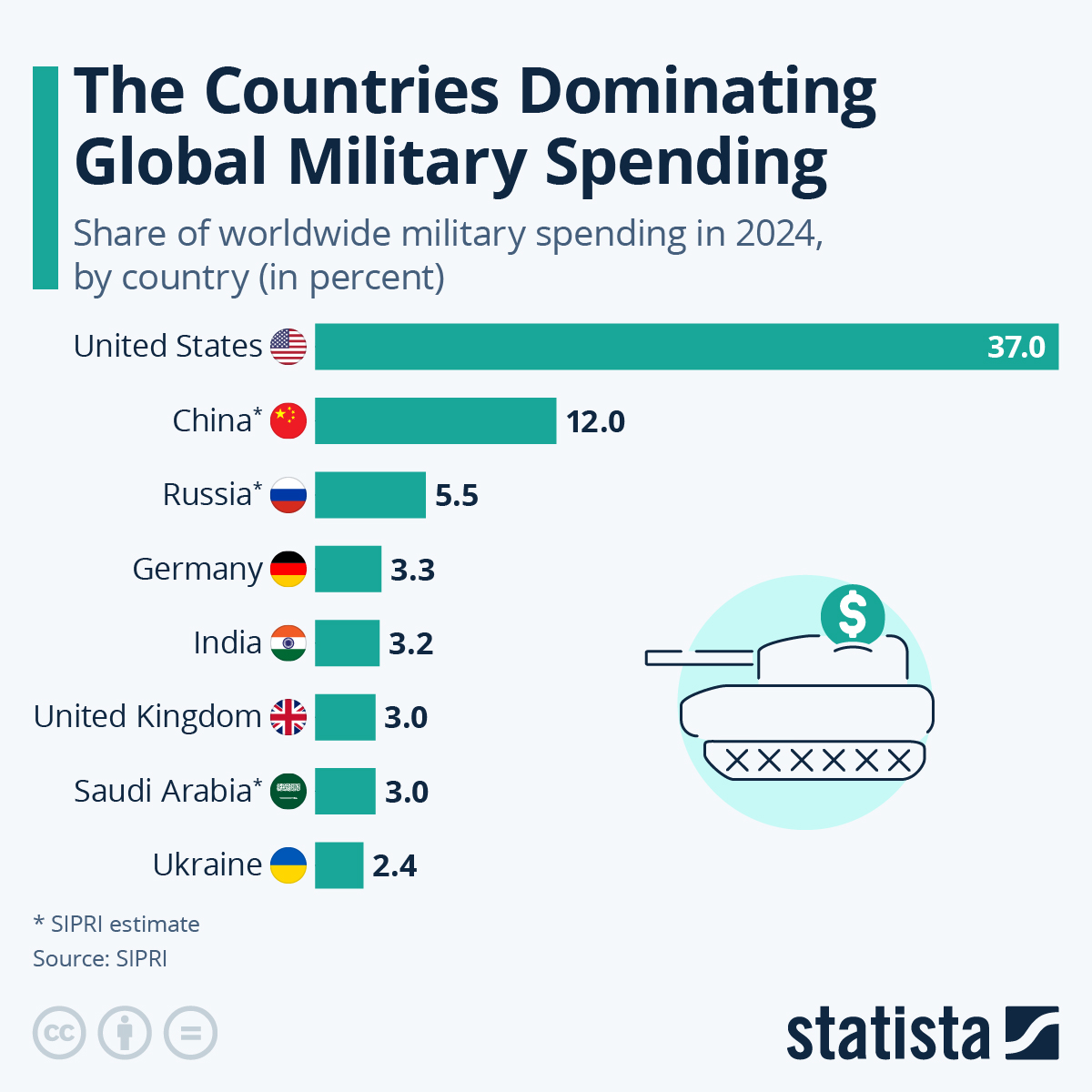 2024년 글로벌 군사비 2.66조 달러 중 미국(37%), 중국(12%), 러시아(5.5%), 독일(3.3%), 인도(3.2%), 영국·사우디(각 3.0%), 우크라이나(2.4%) 등 주요 8개국이 차지한 비중과 시사점을 정리했습니다.