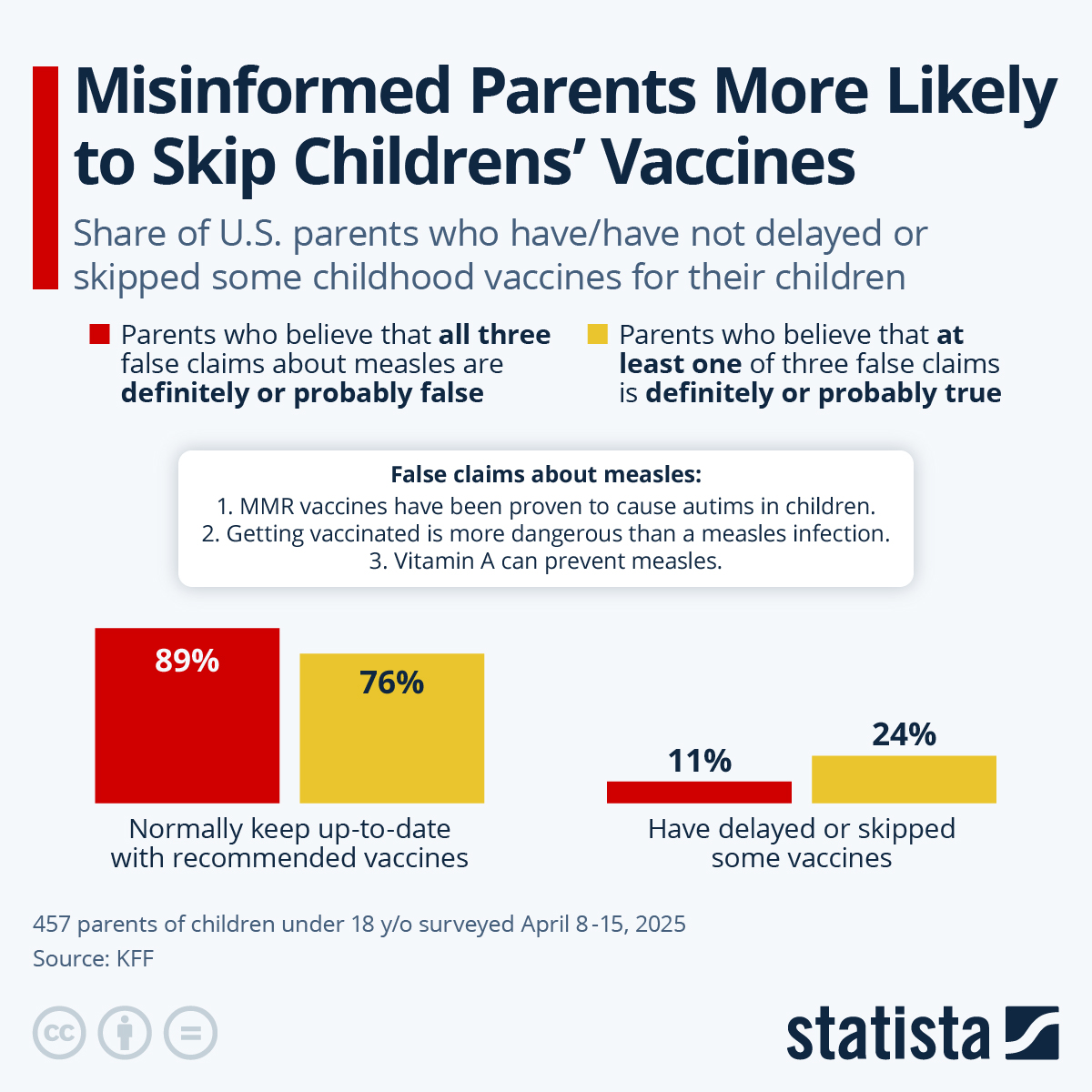 2025년 4월 KFF 설문(18세 미만 자녀 부모 457명)에 따르면, 홍역 백신에 대한 세 가지 대표적 허위주장을 모두 ‘거짓’으로 아는 부모는 89%가 권장 접종 일정을 지켰고, 겨우 11%만 일부 백신을 지연·건너뛰었습니다. 반면, 최소 하나의 허위주장을 ‘사실’로 믿는 부모는 정상 접종이 76%로 떨어지고, 24%가 접종을 지연·건너뛰었습니다.