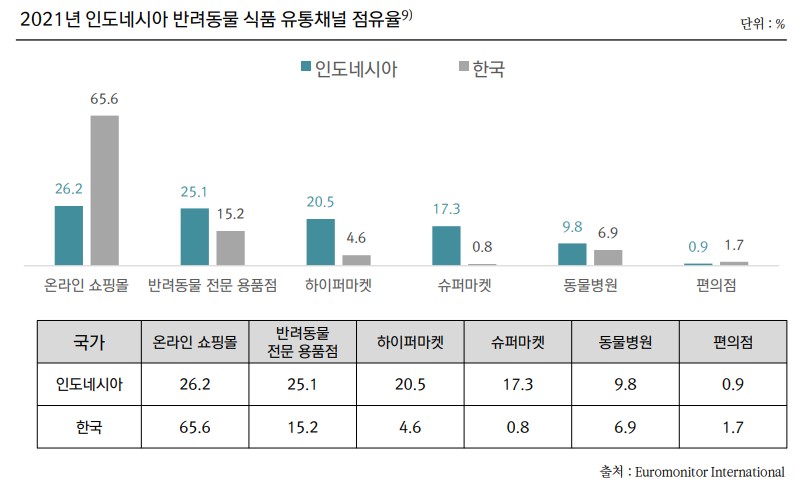 - 전문점(25.1%): PetShop Indonesia, Pet Kingdom 등 전국망. 프리미엄·전문화 이미지로 신제품(곤충 단백질 등) 교육형 전개에 유리. 벤더 등록 시 인증·품질서류 요구.